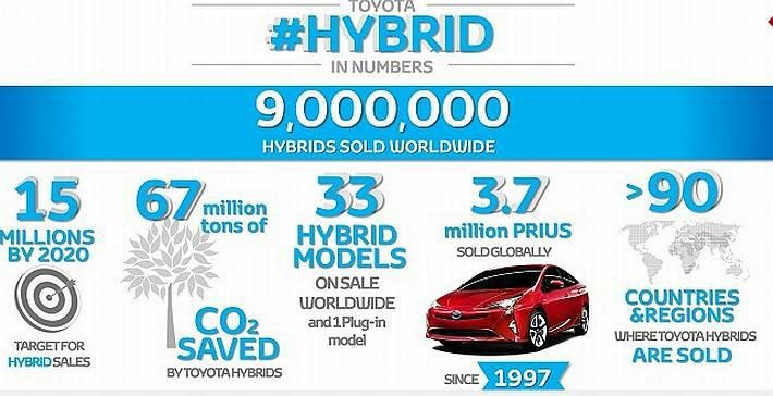 Toyota Motor Corporation s ponosom objavljuje kumulativne podatke globalne prodaje svojih hibridnih vozila, koja je do 30. travnja premašila brojku od 9.000.000 primjeraka1 . Posljednjih milijun primjeraka prodano je u samo devet mjeseci. Jedan od najvećih prioriteta Toyote je smanjenje negativnih učinaka automobilske industrije na okoliš. Stoga je, potaknuta spoznajom da eko vozila mogu imati značajan pozitivan utjecaj samo ako se naveliko koriste, Toyota kroz godine komercijalnog razvoja uspjela potaknuti masovno prihvaćanje hibridnih vozila širom svijeta.