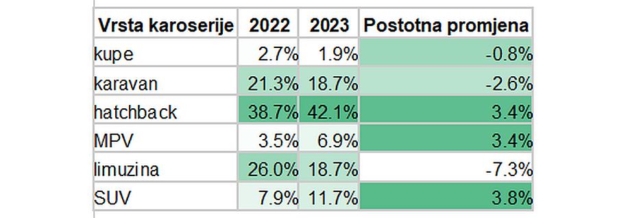 Hatchback je najpopularniji oblik karoserije u Hrvatskoj (na njega otpada 42,1 % svih provjera povijesti automobila provedenih na carVerticalu u 2023.), što je porast s obzirom na 38,7 % u 2022. Iako i limuzine i karavani imaju udio od 18,7 %, to je pad u odnosu na prošlu godinu – smanjenje s 26 %, odnosno 21,3 %.