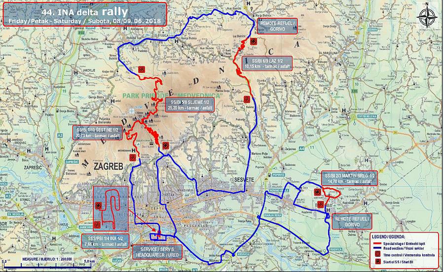 U petak 8.6.2018. u 16:01 svečano je otvoren 44. Ina Delta Rally. Pozdravne govore održali su: Berislav Čegelj, direktor natjecanja koji je pozdravio sve nazočne. Posebno je pozdravio pročelnika gradskog ureda za sport i mlade gosp. Milana Pavelića, izaslanika počasnog pokrovitelja priredbe gosp. Milana Bandića, gradonačelnika grada Zagreba, gosp. Bengt-a Oldsberg-a operativnog direktora rafinerije i marketinga uprave INA-e i predstavnika generalnog pokrovitelja INA-e, predstavnike organizatora Auto kluba Ina Delta Zagreb, na čelu s direktoricom relija gđom. Mirjanom Šimek Bilić Na prvom BI INA Zagreb, najuspješnija je bila hrvatska posada Šebalj/Sabol iz HRV dok je drugo mjesto pripalo posadi POSPIŠILIK/HOVORKA iz CZE, na trećem mjestu je posada ZANON/PICENO iz ITA. Tijekom prvog BI ispalo je pet posada. BI SS2 Martin breg 1 nisu startal 1 posadA dok zbog tehničkog kvara također nije završila 1 posada. Nakon drugog BI/SS3 Martin breg 2, poredak je: 1. T. POSPIŠILIK / J. HOVORKA (CZE) 2. O. BISAHA / P. TEŠINSKY (CZE) 3. B. ZANON / D. PICENO (ITA) BI/SS4 – INA Zagreb 2 posada Šebalj/Sabol uspjela je nadoknaditi vrijeme i probiti se na 3. mjesto. Nakon 4 brzinska ispita završile su 52 posade.