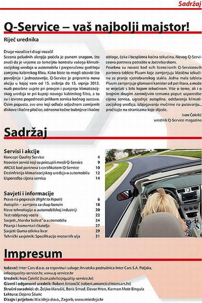 Tvrtka Inter Cars d.o.o. otisnula je treći broj Q-Service magazina, još kvalitetnije i bogatije informacijama od prethodnoga. U njemu je puno korisnih savjeta, ali I popusta na servisu i dijelovima. Sezona peludnih alergija započela je punom snagom što znači da je vrijeme za temeljitu kontrolu klima uređaja u automobilu te preporučenu zamjenu filtera kabine minimalno jednom godišnje. Kako bi to mogli obaviti što jednostavnije i povoljnije, Q-Service je pripremio novu akciju u kojoj od 15. svibnja do 15. srpnja 2012. nudi posebne uvijete pri provjeri i punjenju klima uređaja, kupovini novog filtera kabine te izvrsne pogodnosti prilikom servisa kočionog sistema.