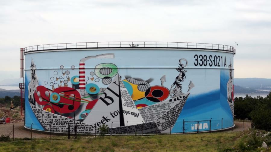 Nakon tri mjeseca napornog rada, službeno je predstavljen atraktivni oslikani spremnik 338-S-021 A Rafinerije nafte Rijeka! Najveći spremnik s muralom u Hrvatskoj djelo je lokalnog umjetnika Edija Gustina Maske, a njegovi motivi mora i broda će u budućnosti krasiti vizuru Općine Kostrena i grada Rijeke u suradnji s kojima je INA i realizirala ovaj projekt.