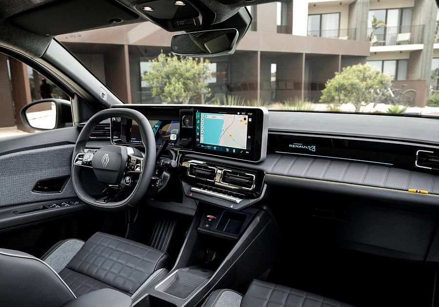 Na razini Evolution, pogled odmah pada na svijetle boje armaturne ploče i obloga vrata, koje su u kontrastu s tamnosivim presvlakama i šavovima u boji francuske zastave. Na razini Techno sve se vrti oko trapera. Kombinacija tamnoplavog tekstila i reciklirane poliesterske tkanine visokozasićene plave boje snažno nalikuje trapericama koje nosimo svaki dan. Bakrene zakovice na bočnim stranama sjedala kriju iznenađenje, natpis: Allez-y vous êtes en Renault 4 („Samo naprijed, u Renaultu 4 si”). Čak su i šavovi bakrene nijanse slične onima na trapericama. Tkanina s presvlaka s dijamantnim uzorkom prisutna je i na armaturnoj ploči i oblogama vrata. Konačno, razina Iconic Renaultu 4 E-Tech electric daje elegantan i sportski izgled. Sjedala i nasloni za glavu presvučeni su sivom tkaninom pepita uzorka sa žutim rubovima te crnom tkaninom dijamantnog uzorka, djelomično iz recikliranih i bioloških izvora. Žuta boja česti je detalj u unutrašnjosti pa je možete naći na rubovima prednjih sjedala, stražnje klupe i armaturne ploče, na kojoj se nalazi i laserski urezan natpis „Renault 4” s pozadinskim osvjetljenjem.