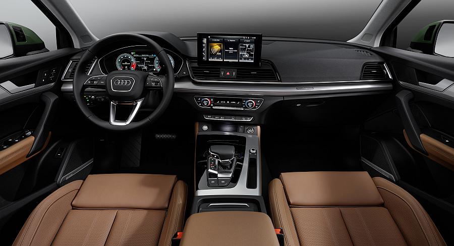 Vodoravni naglasak unutrašnjeg dizajna daje dojam širine i lakoće. Lijepo oblikovana i elegantna linija ukrasnih elemenata razdvaja donji i gornji dio armaturne ploče s fokusom na novi samostojeći MMI dodirni zaslon s akustičnim povratnim informacijama. Više nema prethodne rotacijske/pritisne kontrole na središnjoj konzoli, a njeno mjesto sada zauzima pretinac za odlaganje. Kupci modela Q5 mogu birati između tri izvedbe unutrašnjosti: bazni, interijer design selection i interijer S line, koje se po želji mogu kombinirati s vanjskim dizajnerskim paketom ambijentalnog osvjetljenja +, koji uključuje niz svjetlosnih efekata koji savršeno unaprjeđuju Audijevu karakterističnu izradu.