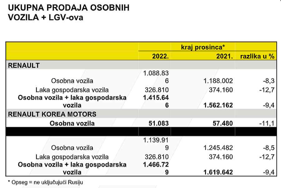 U kontekstu ograničene opskrbe, Renault je u 2022. prodao ukupno 1.466.729 vozila, što je pad za -9,4 % u odnosu na 2021. U Europi je marka ostvarila tržišni udjel od 6,4 % (-0,7 postotnih bodova u odnosu na 2021.) s ukupno 832.605 prodanih vozila. Baš kao i 2021., marka je ostvarila značajan napredak u područjima koja generiraju visoku vrijednost: na rastućem tržištu elektrificiranih vozila***, u C-segmentu, na tržištu privatnih kupaca i u okviru poslovne jedinice lakih gospodarskih vozila.