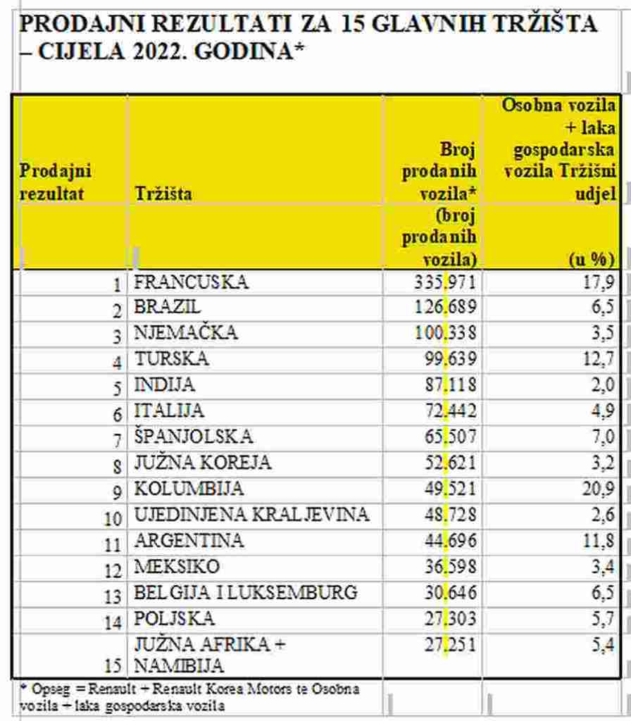 Renault je ostvario rast na ključnim tržištima izvan Europe. Prodano je ukupno 634.124 vozila, što je stabilan rezultat u odnosu na 2021. Udjel prodaje izvan Europe dosegao je 43,2 % ukupne prodaje marke. Na ukupnom tržištu Hrvatske, koje je u odnosu na 2021. palo za 4,4 %, Renault je zadržao 4. mjesto, s tržišnim udjelom od 7,8%, pri čemu je četvrtu godinu za redom zauzeo prvo mjesto u prodaji gospodarskih vozila s 1358 prodanih primjeraka i 19,5 % tržišnog udjela. Najprodavanija laka gospodarska vozila bili su Renault Master i Trafic Van.