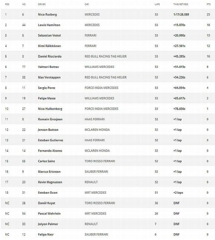 Premda smo svi na utrci za VN Italije na Monzi očekivali dominaciju Hamiltona, desilo se suprotno – vidjeli smo dominaciju Rosberga. Hamilton je u utrku svojim Mercedesom krenuo s pole positiona, ali svoju prednost je izgubio već od samog starta, a vodeću ulogu je preuzeo Rosberg koji je poveo utrku i do kraja utrke svoje prvo mjesto nije ispuštao. Sve se na ovogodišnjoj Monzi uglavnom odigralo u prva dva kruga. Hamilton je loše startao i s prvog je odmah pao na na šesto mjesto, a jednako loše je utrku započeo i Verstappen koji je pao čak na 12. mjesto. Prva dva kruga donose i probijanja nekih vozača, tako je Hamilton u drugom krugu prestigao Ricciarda i zauzima peto mjesto, Alonso se s 12. mjesta probio na deveto, a Massa s 11. mjesta na osmo mjesto. Dakle utrku je poveo Nico Rosberg ispred Vettela, Raikkonena i Bottasa. Zanimljivo je kako su Mercedesi bili na strategiji jednog ulaska u boks, a Hamilton je 12 krugova prije kraja kao drugi za Rosbergom zaostajao 12 sekundi. Rosberg je bez problema održavao prednost ispred momčadskog kolege i došao do svoje prve pobjede u Monzi. To je Rosbergu sedma pobjeda ove sezone, a u karijeri 21., te je sada u ukupnom poretku vozača smanjio prednost vodećeg Hamiltona na samo dva boda. Iduća utrka vozi se za dva tjedna za VN Singapura (18. kolovoz 2016.)