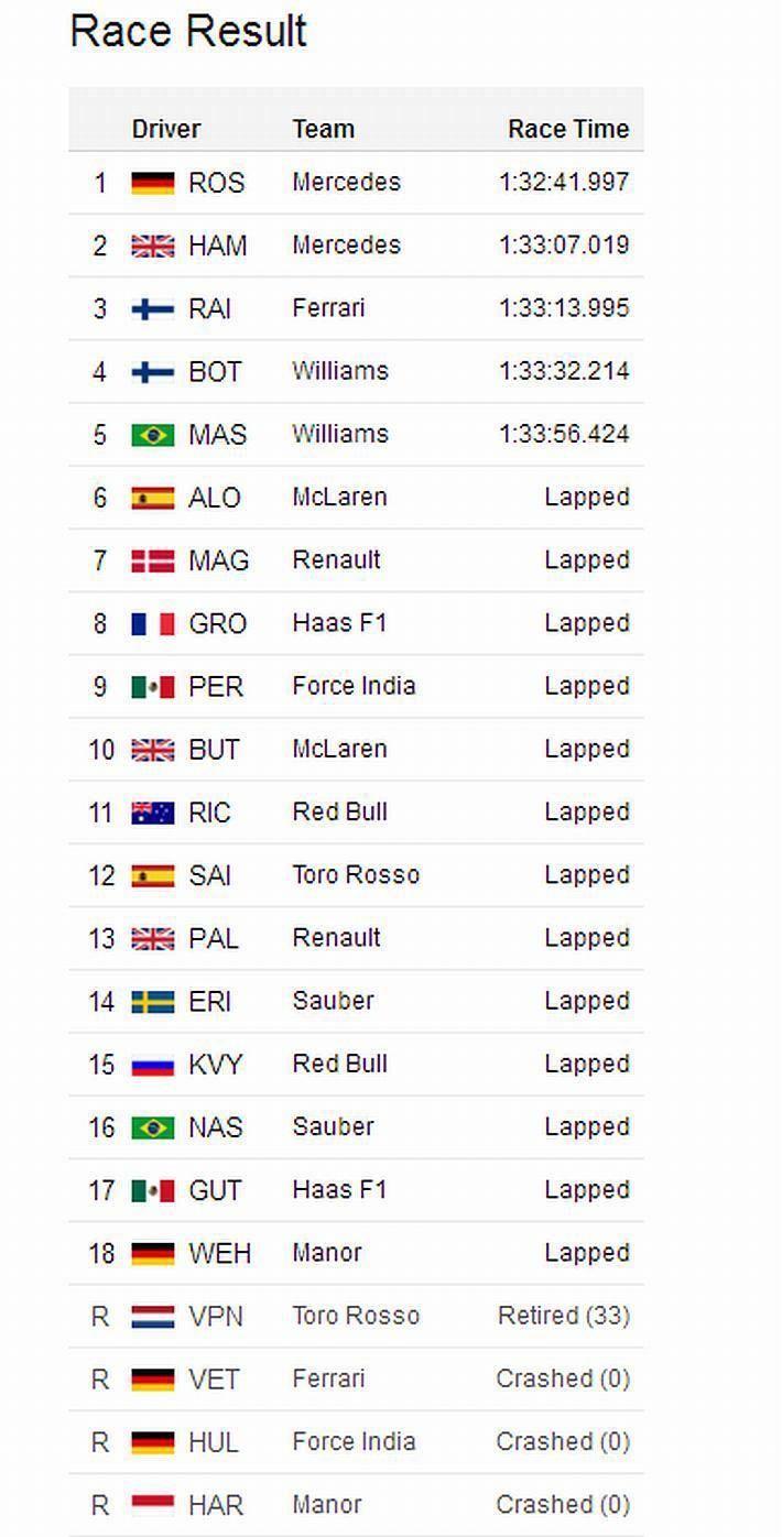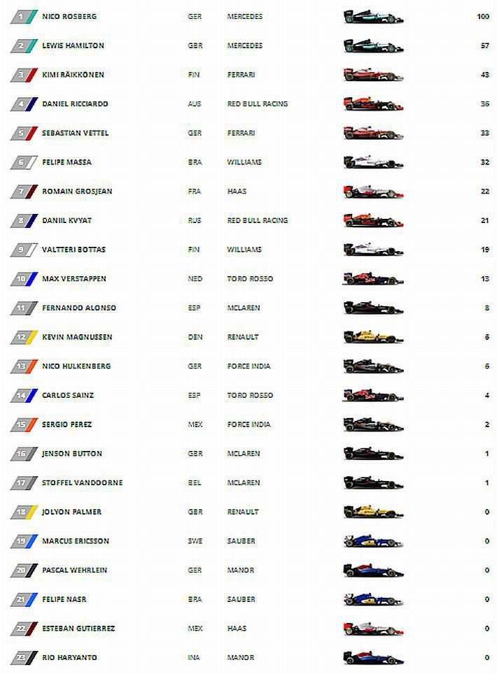 Sve to pomoglo je Rosbergu da dođe do svoje 18. pobjede u karijeri i to sedme u nizu (četvrta ove sezone) na VN Rusije i to ispred momčadskog kolege Hamiltona koji je utrku ipak završio kao drugi. Rosberg tako poslije ove utrke u ukupnom poretku vozača ima prednost ispred Hamiltona od 43 bodova. Ako se pitate gdje je Vettel, moramo njegove obožavatelje razočarati, jer je njegov Ferrarti dva puta udario (u sedam sekundi) Kvyat i to u prvom krugu.