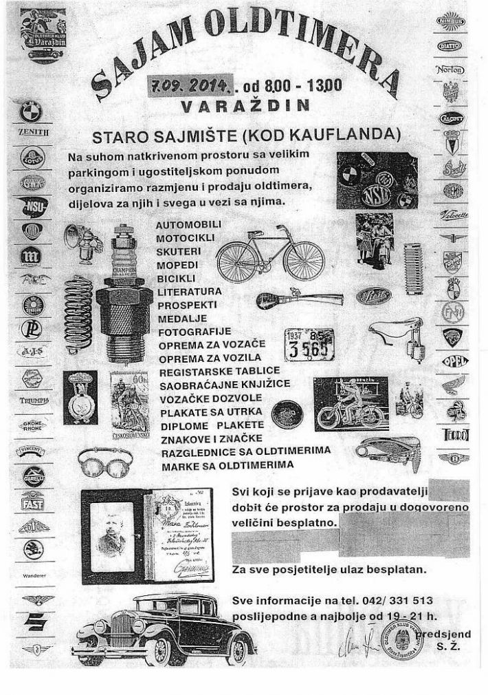 Oko 15.000 oldtimera na hrvatskim cestama sasvim je dovoljan potencijal da se može razgovarati o tržištu s perspektivom. Iako smo dio Europe, još po tom pitanju kaskamo za Europom. Gotovo četredesetak oldtimer klubova dokaz je i da entuzijazma u očuvanju tehničke baštine ne nedostaje unatoč što su vlasnici u svojoj ljubavi prema oktanskim starcima prepušteni uglavnom svom kućnom budžetu i svom guštu. Hrvatska oldtimer scena unazad par godina konačno se može pohvaliti i sa sajmovima oldtimera koji su s vremenom postali dio tradicionalnog okupljanja i s internacionalnim karakterom. Varaždin će tradicionalno ponovno ugostiti ljubitelje oktanskih starina i svega onog što ima bilo kakve veze s kotačima ili čak uopće s tehničkom baštinom. Varaždinski sajam oldtimera održati će se 7. rujna 2014. na starom sajmištu u Varaždinu (kod Kauflanda), u vremenu od 8 do 13 sati. Na sajmu će biti moguće kupiti, prodati ili razmijeniti sve sa mirisom patine, a neće kao niti prošle godine izostati prigodna izložba oldtimer vozila. Za prodavače i posjetitelje ulaz je besplatan, a svima je na raspolaganju i veliki besplatni parking prostor. Naravno, očekuje vas i prigodna ugostiteljska ponuda. Za dodatne informacije u vezi sajma oldtimera možete nazvati kontakt telefone 042/331-513 ili 095/9056-717.