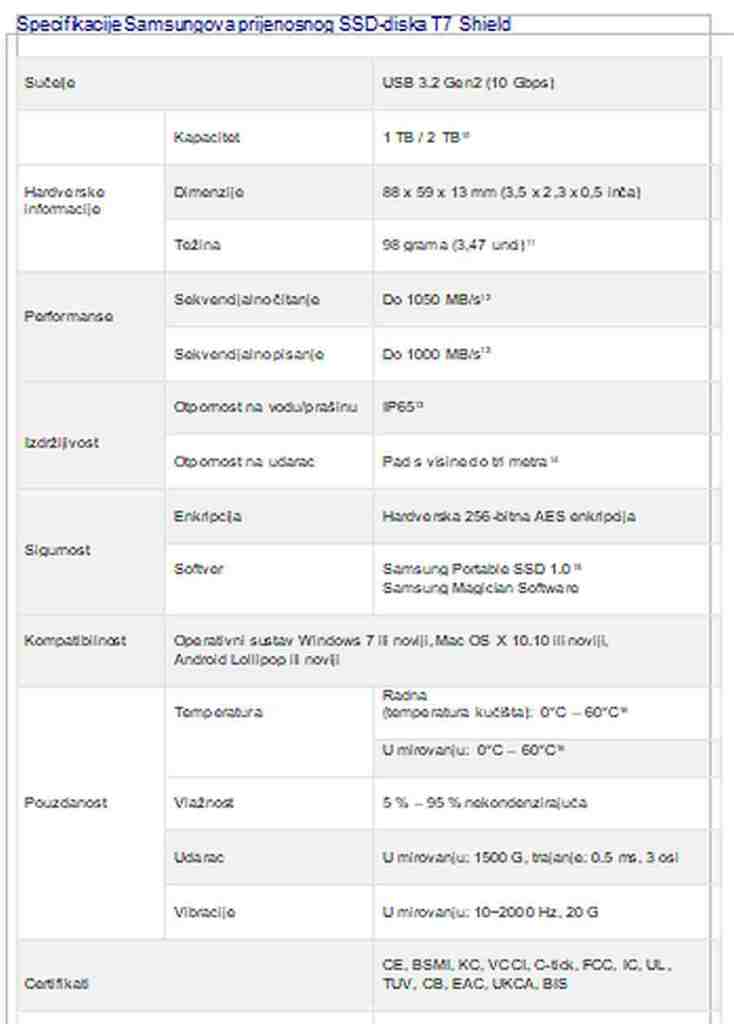 Prijenosni SSD-disk T7 Shield, uređaj za vanjsku pohranu podataka, odlikuju iznimne performanse i pouzdanost kao i izdržljiv dizajn veličine kreditne kartice. Najnoviji je član obitelji Samsung T7 prijenosnih SSD-diskova kojoj pripadaju: disk za svakodnevnu uporabu s nevjerojatno velikom brzinom u elegantnom dizajnerskom rješenju naziva T7 i T7 Touch,1 prijenosni SSD-disk nagrađen na sajmu potrošačke elektronike CES koji ima ugrađen čitač otiska prsta za dodatnu zaštitu podataka.