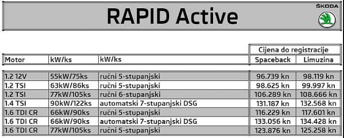 'Nova Škoda Rapid Spaceback predstavlja prekretnicu za marku Škoda: ona za nas znači ulazak u strateški važan segment kompaktnih hatchback modela', kaže predsjednik uprave marke Škoda prof. dr. h. c. Winfried Vahland. 'Rapid Spaceback upotpunjuje ovu klasu, a dobre, praktične karakteristike marke ŠKODA spaja s omiljenim hatchback oblikom. S novim Škoda dizajnom Rapid Spaceback nastupa svježe i dinamično. Sportski elegantan, prostran i praktičan kompaktni model, idealan za mlade kupce i obitelji', kaže Vahland. Nova Škoda Rapid Spaceback naglašava važnost jasnog i samostalnog nastupa – i to na posebno elegantan način. Automobil sa sportskom svježinom i dinamičnom elegancijom, atraktivan i privlačan na prvi pogled. Posebno je dojmljiv pogled s boka. U odnosu na konvencionalne hatchback modele, Rapid Spaceback ima izraženije sportske karakteristike i djeluje izduženije, gotovo nalik coupéu. Time se optički i funkcionalno izdvaja od konkurencije. Dinamičnu siluetu modela Škoda Rapid Spaceback karakteriziraju jasne linije, dug međuosovinski razmak (2.602 milimetra) i oštra, visoka tornado linija. Rapid Spaceback ima C i D stup s trećim bočnim prozorom. U nastavku donosimo cijene Škoda Rapid Spaceback, kao i cijene limuzinske izvedbe Rapid. Spaceback starta od 96.739 kuna, a Limuzina od 98.119 kn za verziju 1,2 12V Active.