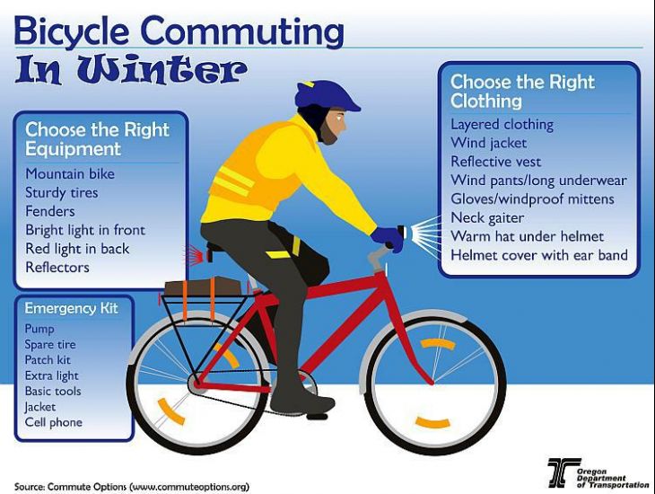 Zadnjih godina sve je veći broj bicikla na našim ulicama i cestama, što je za svaku pohvalu. Uređene su i izgrađene mnoge biciklističke staze, premda dobar dio njih ne odgovara modernim standardima kakvi se koriste u Europi i svijetu s razvijenom prometnom infrastrukturom. Velik broj biciklista odlučio je voziti bicikl u svim godišnjim dobima, pa i po zimi, bila ona suha, mokra ili pokrivena ledom i snijegom. Vožnja po mokrom, zaleđenom ili snijegom pokrivenom asfaltu je jako opasna za neiskusne vozače, a i oni s iskustvom trebaju biti jako pažljivi, jer dovoljan je trenutak nepažnje i pad se ne može izbjeći. No, kako biste se što sigurnije vozili, potrebno je i odgovarajuće pripremiti bicikl, ali i na sebe staviti odgovarajuću obuću i odjeću primjerenu za zimu i niske temperature. Američki Oregon Department of Transportation pripremio je zanimljivu ilustraciju i naputke koje ovom prilikom objavljujemo u nastavku.