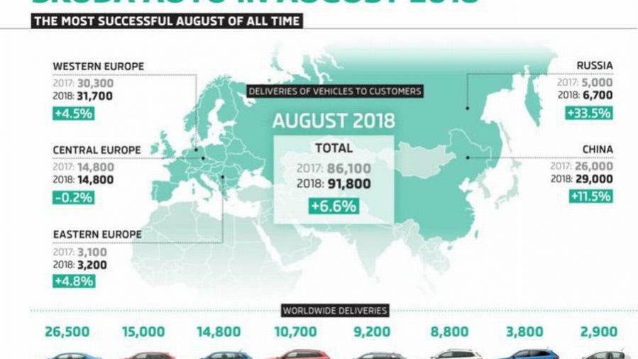 Češki proizvođač automobila iz Mlade Boleslave odlično prodaje na svim svjetskim tržištima. Škoda bilježiti rast prodaje iz mjeseca u mjesec. U kolovozu 2018. Škoda je isporučila 91.800 vozila, što je 6,6% više nego u istom razdoblju prošle godine (kolovoz 2017. – 86.100 vozila). Škoda ima visoki rast prodaje automobila u Rusiji (+ 33,5%) i Kini (+ 11,5%). Škodina prodaja raste i u Europi – u odnosu na isto razdoblje prošle godine (+ 6,0%). Karoq, Fabia i Citigo imaju dvoznamenkasto povećanje prodaje. No, novi rast prodaje će se po svemu sudeći nastaviti, a tome će pripomognuti modeli kao što su SUV Kodiaq koji stiže u novoj izvedbi RS i Scout, te Karoq Scout i Sportline.