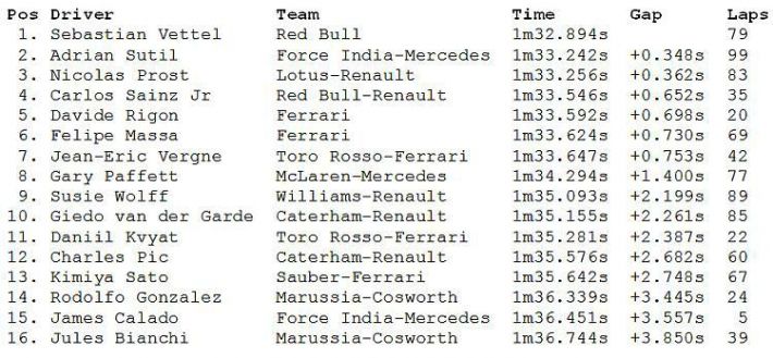 Vodstvo Williamsa je na upit, razmatra li mogućnost da Susie Wolff dobije priliku voziti pravu F1 utrku, s obzirom na odlične rezultate na testiranju jedinog ženskog vozača u F1, odgovorilo: ‘O tome nismo razgovarali ni razmišljali ovog trenutka. Posao koji smo odradili na testiranjima (nove Pirelli gume) imao je sasvim drugačiji cilj od onog kojeg imamo u pravoj utrci.’ Pirelli je za ovo testiranje pripremio nove gume koje će se koristiti na idućoj F1 utrci koja se vozi u Mađarskoj. Pirelli se vratio konstrukciji gume s kevlarom koju je koristio prošle godine, a iskoristio je novi tip mješavine od ove godine. Skoro svi vozači su se pozitivno izjasnili o novim gumama koje ocjenjuju puno boljima i kako s njima mogu puno bolje predvidjeti kako će se ponašati. Hoće li tako biti i na idućoj F1 utrci tek ćemo vidjeti.