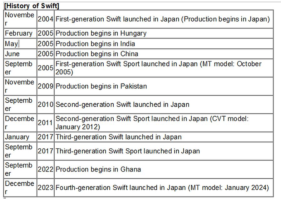 *Na temelju istraživanja Suzukija (uključuje Swift Sport i Dzire. Ne uključuje Swift (model: HT51, inozemni naziv: Ignis) lansiran u Japanu 2000.)
