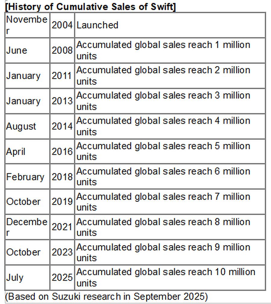 Kompaktni osobni automobil Swift tvrtke Suzuki Motor Corporation postigao je kumulativnu globalnu prodaju od 10 milijuna primjeraka* do srpnja 2025. godine. Ova prekretnica postignuta je 20 godina i 8 mjeseci nakon što je prvi put lansiran u studenom 2004. u Japanu.