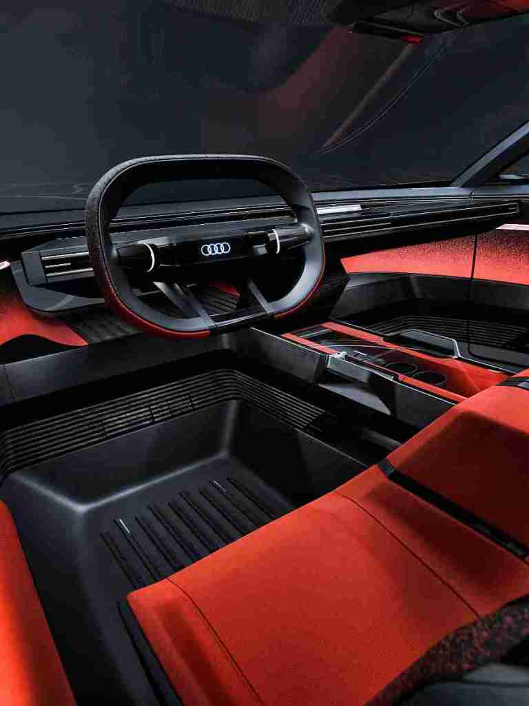 Dojam izuzetne jasnoće i urednosti – ovo doživljava putnik koji kroz širom otvorena vrata ulazi u unutrašnjost modela Audi activesphere. Okomite i vodoravne površine dominiraju arhitekturom prostora, baš kao i pravi kutovi. Horizontalno gledano, zone interijera razlikuju se kontrastnim bojama. U sredini: Površine sjedala i obloge vrata te prednje područje u toploj lava crvenoj boji pri pogledu kroz bočna stakla u ciljanom su kontrastu s tamnim eksterijerom. Iznad i ispod ove središnje zone također dominiraju tamne boje – crna, antracit i tamno siva. Četiri pojedinačna sjedala raspoređena su poput konzola u visokoj, kontinuiranoj središnjoj konzoli. Gornji kraj unutarnjeg bočnog dijela sjedala vodoravno je oblikovan kao naslon za ruke i naliježe na središnju konzolu. Dizajneri su površinu sjedala, leđni dio i dio za ramena oblikovali kao tri odvojene cjeline koje već i vizualno obećavaju dobru bočnu potporu. Istovremeno izgledaju kao da lebde i održavaju ravnotežu između automobilske funkcionalnosti i elegancije lounge ležaljke.