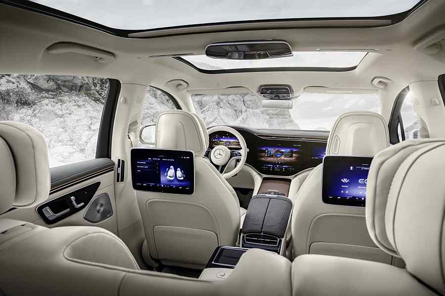 Vrhunac interijera je MBUX Hyperscreen (posebna oprema). Ova velika, zakrivljena jedinica zaslona proteže se gotovo u cijelosti od lijevog do desnog A-stupa. Tri zaslona smješteni su pod zajedničkim pokrovnim staklom i vizualno se spajaju. 12,3-inčni OLED zaslon za suvozača daje mu vlastiti zaslon i kontrolno područje. U Europi, I u sve većem broju zemalja, suvozač na prednjem sjedalu također može gledati dinamične sadržaje dok je vozilo u pokretu. To je zato što se Mercedes-EQ može osloniti na inteligentnu logiku blokiranja temeljenu na kameri u kabini: Ukoliko kamera otkrije da vozač gleda u zaslon suvozača, sustav automatski zatamnjuje dinamički sadržaj. Dolby Atmos zvučni sustav podiže audio iskustvo u EQS SUV-u na novu razinu. Pojedinačni instrumenti ili glasovi studijskog miksa mogu se postaviti po cijelom prostoru slušanja. Nova vrsta zvučne animacije tako postaje moguća: to je zato što dok konvencionalni stereo sustavi obično imaju dinamiku lijevo-desno, Dolby Atmos može koristiti cijeli prostor i stvoriti iskustvo od 360 stupnjeva.