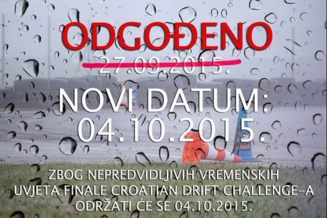 Zbog loših vremenskih uvjeta koji su otežavali pripremu staze i cijelog eventa, organizatori su bili primorani odgoditi finalnu rundu CDC-a koja se trebala održati u nedjelju 27.09.2015., te će se održati u novom terminu 4.10.2015. Svega nekoliko dana dijeli nas od treće i finalne runde Croatian Drift Challengea, prestižnog hrvatskog natjecanja u driftu! Vodeći Marino…