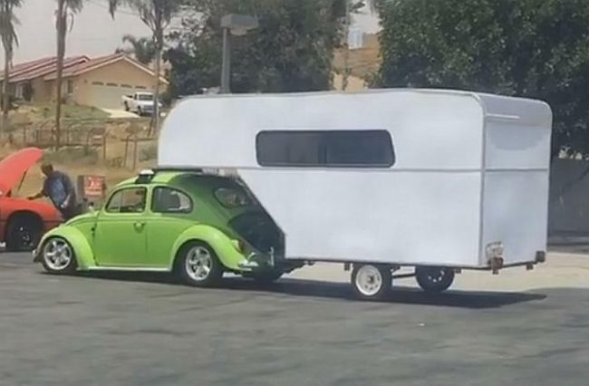 Ovakav način povlačenja prikolice već je viđen, ali uvijek iznova fascinira dovitljivost ljudi da naprave nešto neobično,a tako efikasno. Dakle, kamp prikolica svojim rudom, koje i nema, ne naslanja se na uobičajenu kuku koja je na automobilu smještena obično u razini stražnjeg odbojnika. Koristi se kugla smještena na krovu u ovom slučaju legendarne VW Bube.…