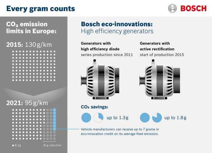 Zakonodavci propisuju ekonomična vozila s niskom emisijom, ali vozači uz učinkovitost traže i zabavu. Bosch je zahvaljujući svojim ekološkim inovacijama pokazao da se ta dva cilja mogu povezati. EU je sada službeno prepoznao generatore s diodama visoke učinkovitosti (HED) i sinkronim aktivnim ispravljanjem (SAR) kao ekološke inovacije. Ove tehnološki napredne komponente čine vozila učinkovitijima i ekonomičnijima, stoga ispunjavaju ciljeve Europske komisije usmjerene na smanjenje emisije CO2. Prema europskim propisima, granična vrijednost emisije za nova vozila odgovara potrošnji goriva od malo više od 4 l/100km. Godine 2013. prosječna emisija CO2 novih vozila još je uvijek iznosila 132,9 g/km. EU oznaku „ekološka inovacija” daje tehnologijama koje smatra izuzetno ekološki prihvatljivima. Proizvođači vozila mogu te tehnologije iskoristiti kao ugljikov kredit za izračunavanje ekonomične potrošnje goriva za vozni park. Najveći dopušteni kredit je 7 g/km. Bosch je dobavljač koji nudi ekološke inovacije koje je odobrio EU: sustav upravljanja akumulatorom za hibridna vozila temeljen na navigaciji i dvije nove tehnologije generatora.