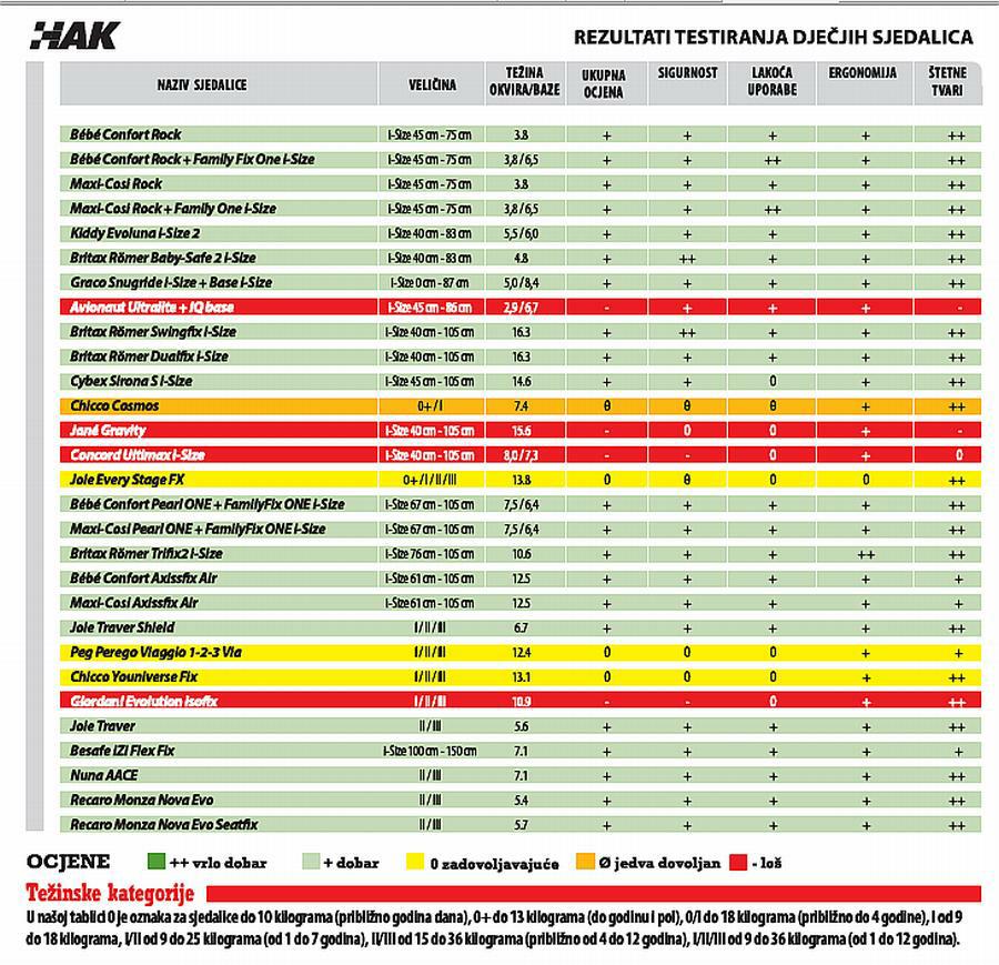 I za kraj, posljednji kriterij ili količina štetnih materijala upotrijebljenih pri izradi auto sjedalice. U najvećem broju slučajeva kandidati su ovdje dobivali maksimalne ocjene, što znači da je kontaminacija uglavnom vrlo niska, odnosno štetnih sastojaka ili potpuno nema ili su u minimalnim količinama. Nažalost, i ovdje su se pronašla dva negativca s neprolaznim ocjenama. Kod sjedalica Avionaut Ultralite + IQ base (djeca od 45 do 86 centimetara ili do godine i pol dana) i Jané Gravity (od 40 do 105 centimetra ili do otprilike 4 godine) kontaminacija je visoka, a štetnih sastojaka mnogo i zbog toga se te dvije sjedalice ne trebaju koristiti i poželjno ih je izbjegavati.