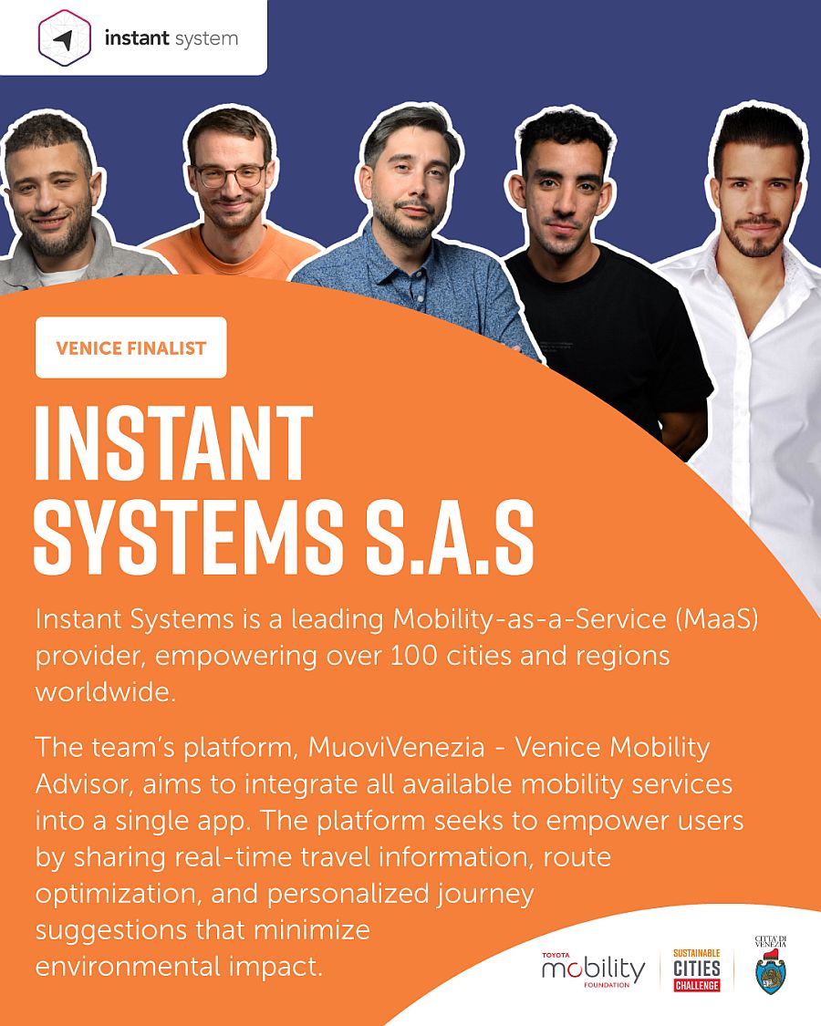 Toyota Mobility Foundation objavila je pet finalista koji su odabrani za nastavak sudjelovanja u izazovu održivih gradova (Sustainable Cities Challenge) u Veneciji, Italija. Finaliste je odabrao stručni žiri nakon rigorozne procjene rješenja usmjerenih na povećanje korištenja postojećih načina prijevoza s niskim ili nultim emisijama ugljika u Veneciji. Izazov, razvijen u suradnji s Gradom Venecijom, organizacijom Challenge Works i World Resources Instituteom, dvostupanjski je globalni projekt vrijedan 9 milijuna dolara i traje tri godine. Cilj mu je potaknuti stanovnike Venecije da koriste aktivnu mobilnost, javni prijevoz i dijeljene oblike mobilnosti na kopnenom dijelu Venecije.Od više od 120 pristiglih prijava, deset je timova ušlo u polufinale i tijekom šest mjeseci dodatno razvijalo i prilagođavalo svoja rješenja. Samo pet polufinalista odabrano je za ulazak u finalnu fazu, temeljem kriterija kao što su: inovativnost, utjecaj, upotrebljivost, izvedivost i kapacitet tima. Žiri je tražio rješenja koja ne samo da potiču promjenu ponašanja prema održivijem prijevozu, već i duboko razumiju lokalni kontekst, potrebe korisnika te mogućnosti provedbe. Svaki je tim morao predstaviti jasan plan demonstracije s mjerljivim pokazateljima uspjeha kako bi se osigurao dugoročni učinak i skalabilnost.