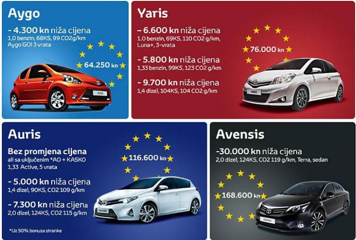 Najavom novih trošarina koje stupaju na snagu 1. srpnja očekuje se povećanje cijena mnogih vozila. Za razliku od ostalih automobilskih marki, Toyota, najzelenija kompanija na svijetu, odlučila je sniziti cijene svojih vozila. Stoga, nema razloga da odgađate kupnju automobila. Ukoliko zaista želite uživati u ljetu, nagradit ćete se jedinstvenim iskustvom tihe vožnje sa najnižim emisijama CO2 te već danas ugovoriti svoju novu Toyotu uz nižu cijenu! Neka vaš odabir budu modeli Aygo, Yaris, Auris, Avensis ili Prius koji posjeduju prednosti čiste i efikasne tehnologije Toyota Optimal Drive i Hybrid Synergy Drive. Oduševit će vas tihom vožnjom uz niske emisije CO2 i nisku potrošnju goriva, niskim troškovima održavanja te čak 5 godina jamstva bez ograničenja kilometara.Više informacija zatražite od najbližeg ovlaštenog Toyota partnera. Povoljne cijene Toyotinih automobila možete pročitati na linku TOYOTA CJENIK.