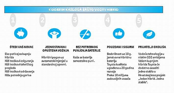 Čak 10 godina jamstva na hibridnu bateriju još jedan dobar razlog zašto voziti hibridno vozilo. Slaveći 20 godine hibridne tehnologije Toyota je za sve kupce hibridnih modela osigurala još bolje ponude i pogodnosti. Toyotina napredna Hybrid Synergy Drive® tehnologija inteligentno udružuje električni i benzinski motor osiguravajući jednostavnu i opuštenu vožnju uz automatski mjenjač u standardnoj opremi, bez potrebnog punjenja baterije. Uz 10 godina jamstva na hibridnu bateriju i eko poticaje za kupnju hibridnih modela Toyota ima hibrid za svakoga.