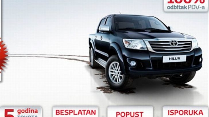 Uštedite i osigurajte isporuku posljednjih primjeraka Toyota Hilux po atraktivnim uvjetima, a prije drastičnog poskupljenja koje se, uslijed novih trošarina, očekuje od 1. srpnja 2013. U posebnoj ponudi nalazi se robustan i izdržljiv Hilux Double Cab s pogonom 4×4, uz motor 3.0 D-4D te paket opreme City s automatskim mjenjačem. Kupcu se poklanja automatski mjenjač i popust od 10.000 kuna te se osigurava isporuka prije poskupljenja. Ukupna ušteda iznosi 2.700 eura. Količina je ograničena na svega 17 vozila koja su dostupna u kontaktu s ovlaštenim Toyota trgovcima u Hrvatskoj. Potencijalnim kupcima skrećemo pozornost da se od 1. srpnja 2013 očekuje poskupljenje koje bi prema posljednjim izračunima iznosilo oko 11.900 eura.