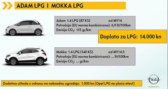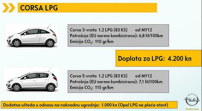 Opel je kao prvi proizvođač automobila na hrvatskom tržištu još prije više od godinu dana ponudio modele s tvorničkom ugradnjom instalacije za korištenje ukapljenog naftnog plina kao pogonskog goriva. No, od nedavno, cijena modela opremljenih LPG instalacijom značajno je smanjena, zahvaljujući prvenstveno nižim troškovima ugradnje, ali i novim trošarinama vezanim uz emisiju ugljičnog dioksida. Zbog toga je Opel u Hrvatskoj odlučio krenuti sa kampanjom upravo za modele s tvornički ugrađenom LPG instalacijom i punom tvorničkom garancijom. Opel u svojoj ponudi ima čak sedam modela u koje se ugrađuje Landirenzova LPG oprema vrhunske kvalitete, a cijena LPG konverzije ovisi od modela do modela i kreće već od 3.800 kn.