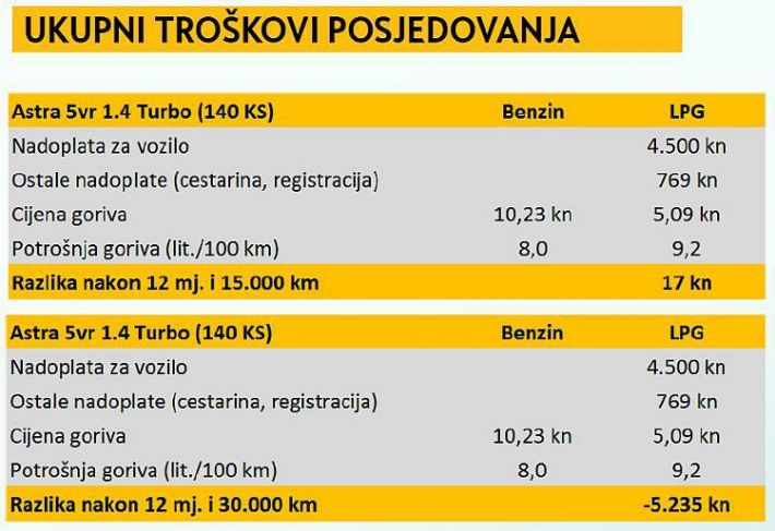 Kod Astre, LPG kupac koji godišnje napravi 15 000 km, već u prvoj godini uštedi 8.000 kn u odnosu na vozača koji kupi Astru diesel sa 130 KS u istom paketu opreme. Dok oni koji rade nešto više kilometara, recimo 150.000 u pet godina, u tom periodu štede čak 41.000 kn u odnosu na one koji voze identičnu, benzinom pokretanu Astru. (Izračuni ukupnog troška posjedovanja, kao i modeli i motori te cijena konverzije nalaze se u nastavku…