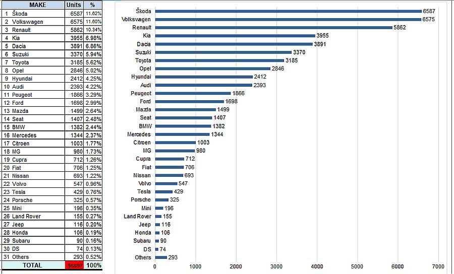 U cijeloj 2023. godini u Hrvatskoj najviše registriranih ovih automobila imala je marka Škoda s registriranih 6.587 automobila što je udio na tržištu od 11,62 posto. Druga marka je Volkswagen sa 6.575 registriranih novih automobila (11,60 posto), treći je Renault sa 5.862 novih automobila (10,34 posto). Četvrto mjesto uzela je KIA (3.955), a peta je Dacia (3.891). Šesti je Suzuki, a dalje su se poredali Toyota, Opel, Hyundai, Audi, Peugeot, Ford, Mazda, Seat, BMW, Mercedes, Citroen, MG, Cupra, Fat, Nissan, Volvo…Samo da napomenemo kako je registrirano 429 automobila Tesla, 325 Porschea, 5 Ferrarija, 4 Bentlija, 4 Maseratija, 2 Rimca, 1 Aston Martin i 1 McLaren.