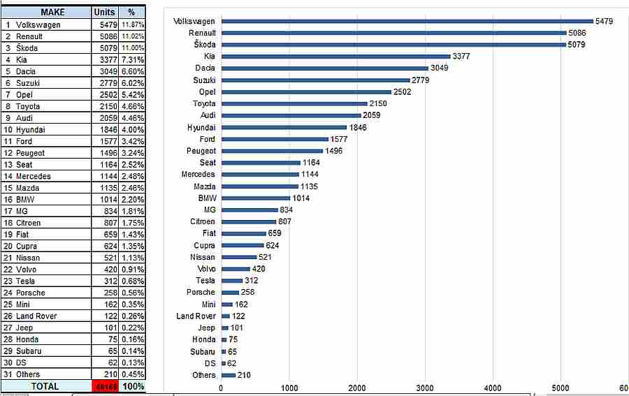 U devet mjeseci 2023. najviše registriranih ovih automobila imala je marka Volkswagen s registriranih 5.479 automobila što je udio na tržištu od 11,87 posto. Druga marka je Renault sa 5.086 registriranih novih automobila (11,02 posto), treća je Škoda sa 5.079 novih automobila (11,00 posto). Četvrto mjesto uzela je KIA (3.377), a peta je Dacia (3.049). Šesti je Opel, a dalje su se poredali Toyota, Audi, Hyundai, Ford, Peugeot, Seat, Mercedes, Mazda, BMW, MG, Citroen, Fiat, Cupra, Nissan, Volvo, Tesla, Porsche, Mini, Land Rover…