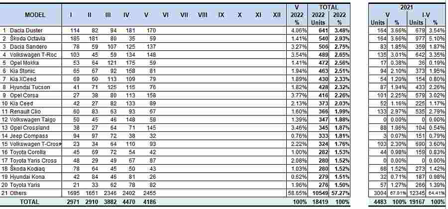 U Hrvatskoj je u pet mjesecia ove godine kao najviše registrirani novi automobil isplivao sa prodanih 641 primjeraka automobila Dacia Duster, a drugi je automobil Škoda Octavia sa 540 novih automobila.