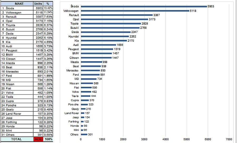 U sedam mjeseci 2024. najviše registriranih ovih automobila imala je marka Škoda s registriranih 5.953 automobila što je udio na tržištu od 13,42 posto. Druga marka je Volkswagen sa 5.118 registriranih novih automobila (11,54 posto), treći je Renault sa 3.387 novih automobila (7,63 posto). Četvrto mjesto uzeo je Opel (3.173), a peta je Toyota (2.828). Šesti je Suzuki, a dalje su se poredali Dacia, Hyundai, KIA, Audi, Peugeot, BMW, Citroen, Mazda, Seat, Mercedes, Ford, MG, Nissan, Fiat, Volvo, Tesla, Cupra, Porsche, Geely, Land Rover, Jeep, Forthing, Honda, Mini, Alfa Romeo, Lexus, DS, Subaru, Jaguar… Samo da napomenemo kako je registrirano 444 automobila Tesla, 26 automobila Jaguar, Bentley 4, Ferrari 4, Astin Martin 3, Maserati 2, Lamborghini 1, Rimac 1, Rolls-Royce 1…