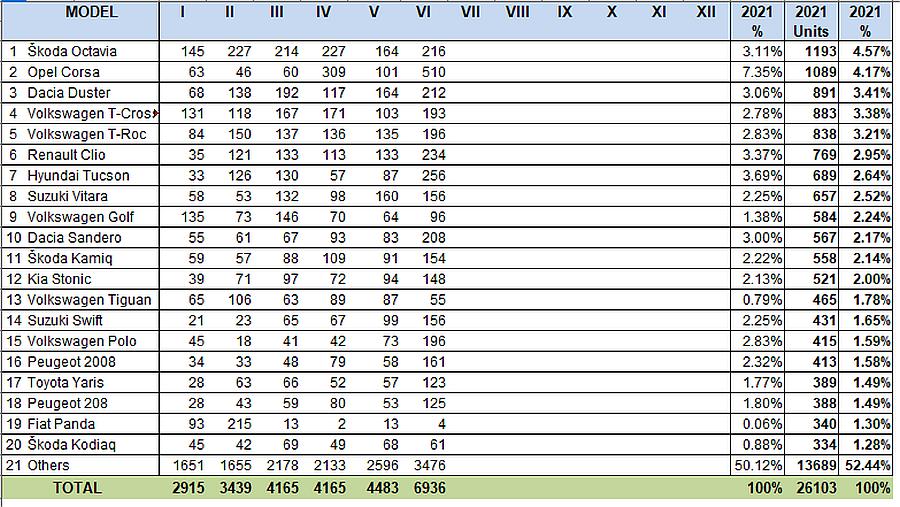 Iza automobila Octavia plasirali su se Opel Corsa, Dacia Duster i VW T-Cross