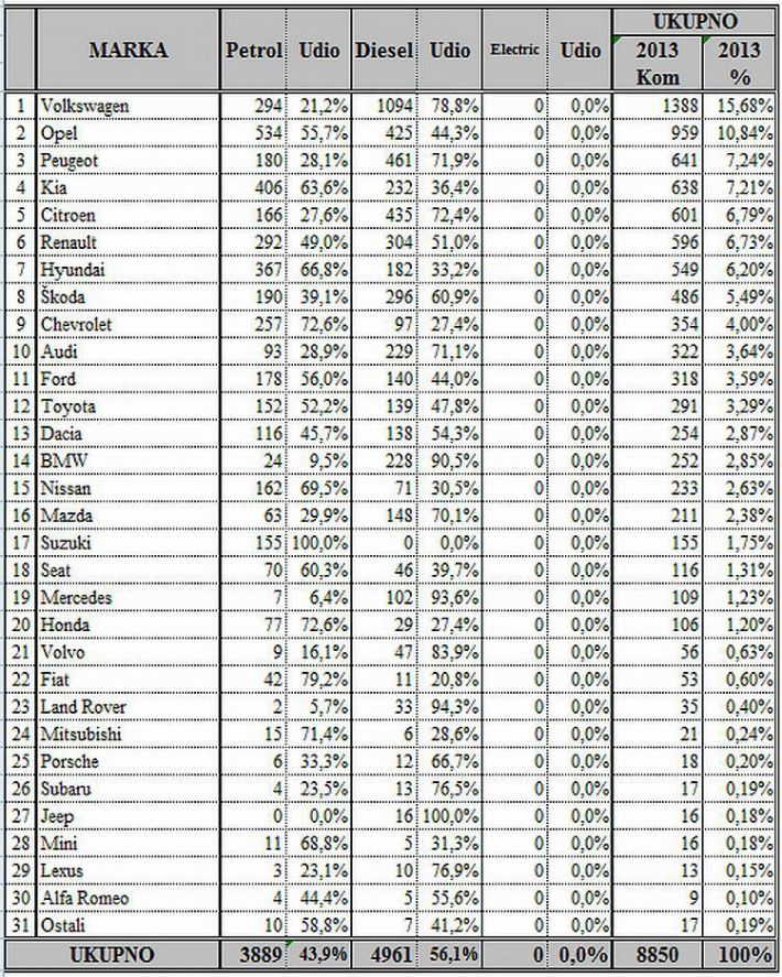 Najprodavanija marka u četiri mjeseca 2013. opet je uvjerljivo Volkswagen koji je prodao ukupno 1.388 osobnih automobila, što je udio na tržištu od visokih 15,68 posto. Drugoplasirani Opel prodao je 959 osobnih automobila s udjelom tržišta od 10,84 posto, a treći je Peugeot s prodanih 641 osobnih automobila i udjelom na tržištu od 7,24 posto. Četveroplasirana je KIA s prodanih 638 automobila (7,21 posto). Iza njih su se poredali Citroen, Renault, Hyundai, Škoda i Chevrolet. Jedno je nepromijenjeno .- VW i dalje uvjerljivo drži prvo mjesto, ali zahvaljujući velikoj floti Insignia prodanih u ožujku, prvi put je uz VW i Opel dostigao udio na tržištu iznad 10 posto.