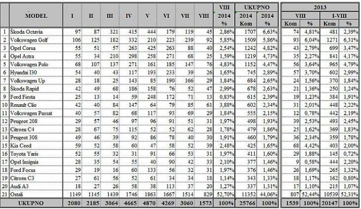 Kod registracije novih automobila gledanih prema modelu automobila, najprodavaniji osobni automobil u Hrvatskoj u prvih osam mjeseci 2014. I ovaj put je Škoda Octavia (flota policiji) s 1.707 automobila i udjelom od 6,63 posto, a donedavno najprodavaniji VW Golf je drugi sa 1.509 automobila (5,86 posto). Treća je Opel Corsa sa 1.242 (4,82 posto), četvrta je Opel Astra sa 1.219 komada, peti je VW Polo sa 1.152 komada, a šesti Hyundai i30 sa 745 primjeraka – slijede VW up!, Škoda Rapid, Ford Fiesta, Renault Clio, VW Passat, Peugeot 208, Peugeot 308… U prvih osam mjeseci 2014. godine je udio automobila s benzinskim motorom u registracijama novih bio 38,0 posto, a s dizel motorom 61,9 posto. Registrirano je I sedam elektrilčnih automobila. Najviše automobila registrirano je u Zagrebu (8.169), a potom u Požeško-slavonskoj regiji (3.220), Splitsko-dalmatinskoj (2.214), Bjelovarsko-bilogorskoj (2.046) i Primorsko-goranskoj regiji (2.011).