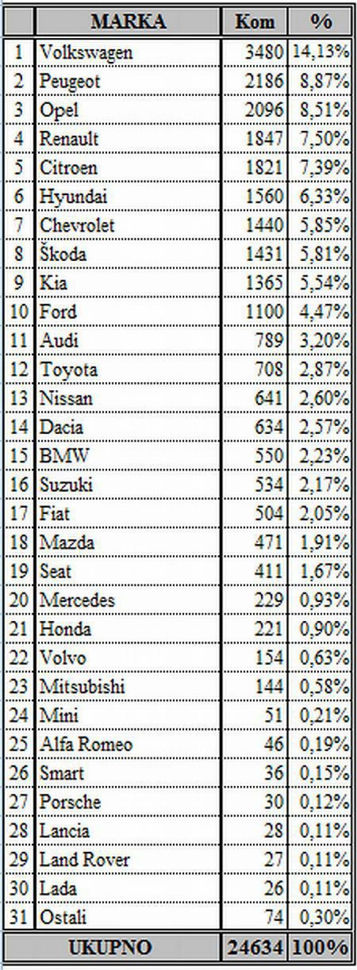 Volkswagen je jedina marka koja je ima udio na tržištu iznad 10 posto. Drugoplasirani Peugeot prodao je 2186 osobnih automobila s udjelom tržišta od 8,87 posto, a treći je Opel s prodanih 2096 osobnih automobila i udjelom na tržištu od 8,51 posto. Četveroplasirani je Renault s prodanih 1847 automobila (7,50 %). Iza njih su se poredali Citroen, Hyundai, Chevrolet, Škoda, KIA i Ford.
