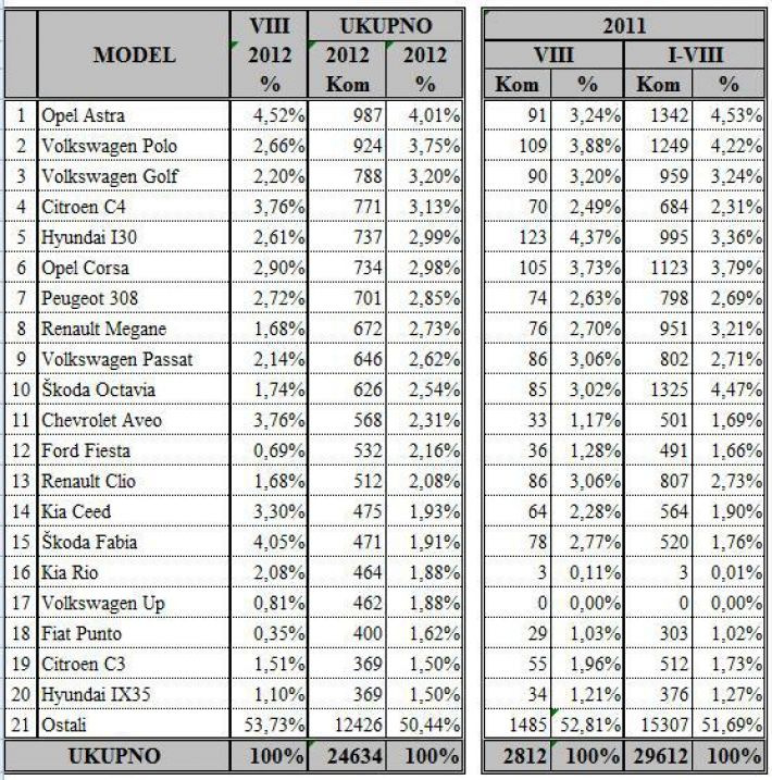 U konkurenciji top modela, najprodavaniji osobni automobil u Hrvatskoj u prvih osam mjeseci u 2012. bila je Opel Astra sa 987 prodana primjerka. Drugi na listi najprodavanijih modela osobnih automobila jest VW Polo sa 924 primjeraka, a trećeplasirani je Volkswagen Golf sa 788 prodanih primjeraka. Četvrto plasirani je Citroen C4 sa 771 prodanih primjeraka, a peti je Hyundai i30 sa 737, a šesta Opel Corsa (734 primjeraka). Zanimljiv je podatak kako VW s modelima Polo, Golf i Passat drži drugo, treće i deveto mjesto na listi top najprodavanijih automobila. Uspjeh VW koncerna upotpunjuje deseta Škoda Octavia koja je prodana u 626 primjeraka.