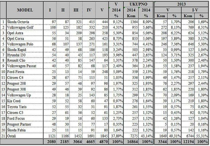 Kod registracije novih automobila gledanih prema modelu automobila, najprodavaniji osobni automobil u Hrvatskoj u prvih pet mjeseca 2014. O ovaj put je Škoda Octavia (flota policiji) s prodanih 1.364 automobila i udjelom od 8,09 posto, a donedavno najprodavaniji VW Golf sada je drugi sa 955 prodanih automobila (5,66 posto). Treća je Opel Astra sa 854 (5,06 posto), četvrta je Opel Corsa sa 853 komada lime je preskočila VW Polo koji je četvrti sa 744 komada, a šesta Škoda Rapid sa 503 primjeraka – slijede Hyundai i30, Renault Clio, VW Passat, Ford Fiesta, Citroen C4, Peugeot 208, Peugeot 308… U prvih pet mjeseca 2014. godine je udio automobila s benzinskim motorom u prodaji novih bio 38 posto, a s dizel motorom 62 posto. Najviše automobila prodano je u Zagrebu (5.403), a potom u Požeško-slavonskoj regiji (2.174), Splitsko-dalmatinskoj (1.370) i Primorsko-goranskoj regiji (1.313).