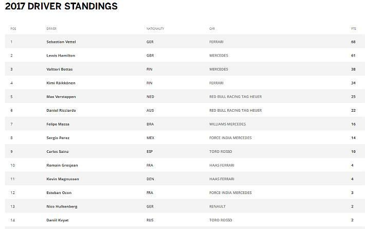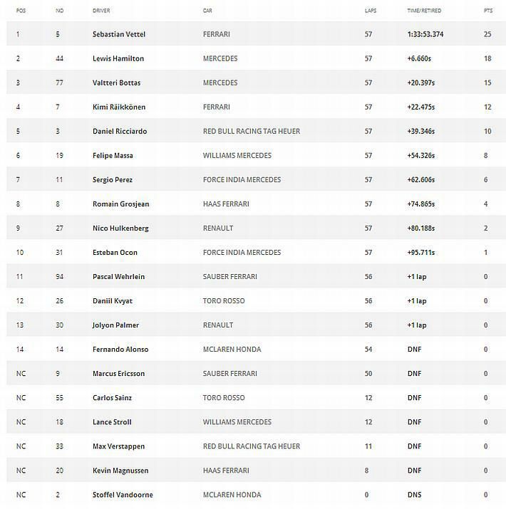 Tada je Hamiltonu preostalo u zadnjih devet krugova pokušati nadoknaditi zaostatak od čak 12 sekundi za Vettelom, ali to je bilo nemoguće. Tako je prvim mjestom Vettel ispred drugog Hamiltona ostvario poslije tri utrke sedam bodova prednosti u prvenstvu. Vettel je tako za Ferrari u ovoj sezoni od tri utrke postigao dvije, a ovo je ujedno 226. prvo mjesto Ferrarija u povijesti. Fernando Alonso opet nije završio utrku u svom očajnom bolidu McLaren Honda, a njegov momčadski kolega Stoffel Vandoorne nije ni startao utrku zbog kvara motora. Iduća utrka vozi se za VN Rusije u Sočiju 30. travnja 2017.