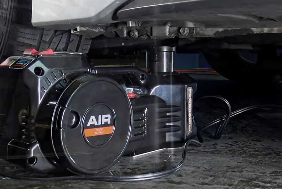 Prikazana automobilska dizalica radi po sustavu „two-in-one“, jer radi se o uređaju koji istovremeno ima dvije funkcije – ima ulogu dizalice za podizanje automobilske karoserije i kompresora zraka za automobilske gume.