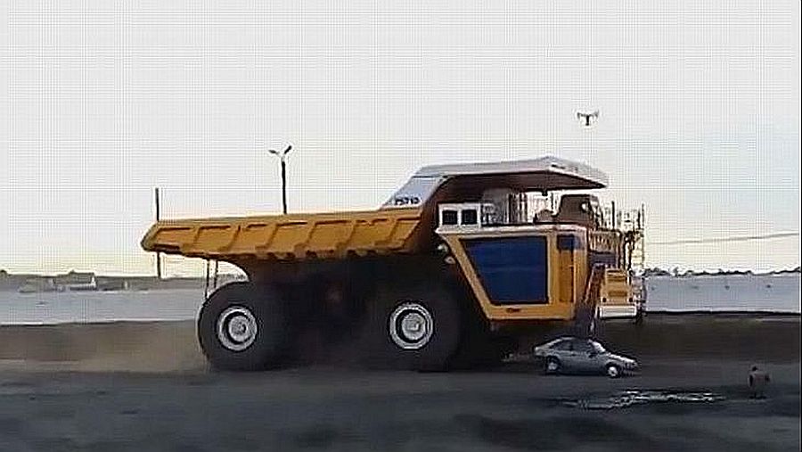 David protiv Golijata. U ovom slučaju mali David nije imao šanse u srazu s ovim Golijatom. Jer, Golijat je u ovom videu dumper kamion BelAZ 75710 mase 500 tona koji se koristi u velikim iskopima, te ima obujam teretnog prostora najveći na svijetu. Samo njegova visina gume je tri puta veća od visine osobnog automobila koji mu se suprotstavio. Kako je sraz ova dva vozila završio vjerujemo kako pretpostvljate, ali pravi odgovor naći ćete u videu…