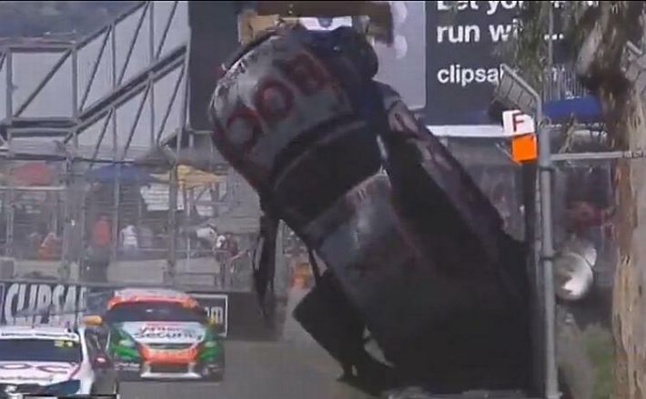 Deblji sloj guma uz betonsku zaštitnu ogradu značajno je ublažio udarac, a Jason Bright vozeći bolid V8 Supercars serije je imao veliku sreću u ovoj nesreći što je automobil imao kontakt s ogradom stražnjim krajem, tako da je vozač na kraju završio na krovu, i to bez težih ozljeda. Uostalom pogledajte video sa stravićnom nesrećom u nastavku…
