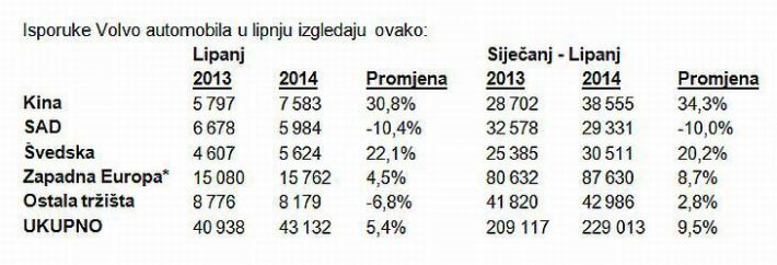 Volvo je objavio prodajne rezultate za lipanj te prvih šest mjeseci 2014. godine. U lipnju je diljem svijeta prodano 43.132 Volvo automobila, što je za 5,4 posto više u odnosu na isti mjesec 2013. godine. U isto vrijeme, Volvo je u prvih šest mjeseci 2014. godine zabilježo prodaju ukupno 229.013 automobila, što je čitavih 9,5 posto više u odnosu na isto razdoblje prošle godine. Konstantno jaka potražnja na ključnim svjetskim auto tržištima (Kina, Švedska i Zapadna Europa), razlog je zbog čega Volvo već dvanaesti mjesec zaredom bilježi rast prodaje. 'To što imamo konstantan rast tijekom proteklih 12 mjeseci naglašava uspješan transformacijski put Volvo Cars kompanije. Kako je prvih šest mjeseci ove godine uspješno iza nas, možemo zaključiti da je Volvo imao odličan start u 2014. godini.', ističe Alain Visser, stariji doredsjednik odjela za marketing, prodaju i brigu o kupcima pri Volvo Cars kompaniji. Prodaja u Kini je porasla za 30,8 posto u odnosu na lipanj prošle godine. Isporučeno je 7.583 automobila, što je još jedan mjesečni prodajni rekord. Volvo XC60 i dalje je najpopularniji model, a slijede ga „domaći“ S60L, te V40. U prvih šest mjeseci ove godine Volvo je u Kini prodao 38.555 automobila, što predstavlja porast od 34,3 posto u odnosu na prvih šest mjeseci 2013. godine.