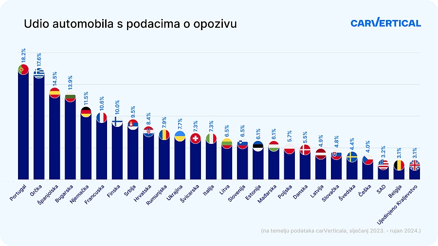 Među automobilima koje je carVertical provjerio u Hrvatskoj, njih 8,4% bilo je povučeno barem jednom. To Hrvatsku svrstava na 9. mjesto od 26 zemalja obuhvaćenih istraživanjem. Približno 37,6% tih automobila imalo je sanirane kvarove, dok je većina ostala na cestama s neriješenim problemima ili nepoznatim statusom.