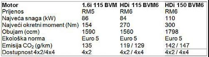 Dizelski 1.6 HDI turbo motor s direktnim ubrizgavanjem goriva i intercoolerom razvija najveću snagu 114 KS pri 3600 o/min i najveći okretni moment 270 Nm u rasponu od 1750 do 2500 o/min. Dolazi u kombinaciji s ručnim mjenjačem sa šest stupnjeva prijenosa i pogonom na prednje kotače (4×2) ili sva četiri kotača (4×4) s tri načina pogona. Razvija najveću brzinu 182 km/h (4×4 – 180 km/h), a s mjesta do 100 km/h ubrza za 10,8 sekundi (4×4 – 11,6 s). Potrošnja dizela u gradu je 5,3 l/100km, na otvorenoj cesti 4,2, a kombinirano 4,6 l/100km (4×4 – 5,6/4,5/4,9).