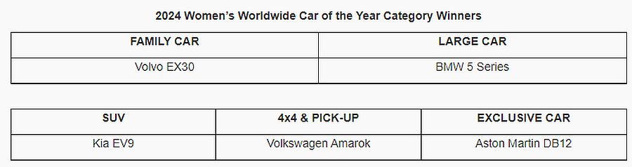 Sva ova vozila predstavljaju izvrsnost u svojim segmentima u smislu sigurnosti, vožnje, tehnologije, udobnosti, učinkovitosti, utjecaja na okoliš i vrijednosti za novac. Ukupno 62 kandidata bilo je u utrci za osvajanje jedne od WWCOTY kategorija. Svi oni moraju ispunjavati uvjet da su lansirani na najmanje dva kontinenta između 1. siječnja i 31. prosinca 2023. godine. Ovo je 14. izdanje nagrada koje dodjeljuje WWCOTY koji se sastoji od tima od 75 žena automobilističkih novinarki iz 52 zemlje na pet kontinenata. To je jedini žiri sastavljen isključivo od žena u automobilskoj industriji u cijelom svijetu. Rad članova žirija tijekom protekle godine obilježio je tržište u k ontinuiranoj evoluciji prema učinkovitijim i održivijim modelima.
