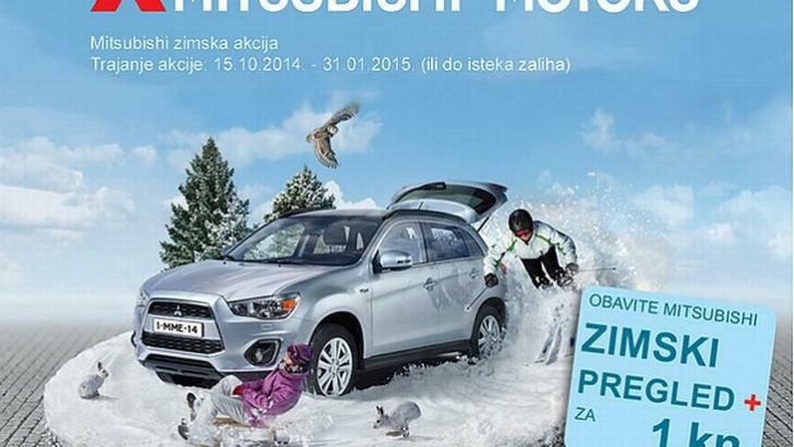 Sa 15. listopadom 2014. započela je već tradicionalna zimska servisna akcija kod svih ovlaštenih Mitsubishi Motors partnera. Za svega 1 kunu možete obaviti kontrolni pregled Mitsubishi vozila u 15 točaka te ostvariti popuste do 30% na različiti potrošni materijal i dodatnu opremu. Posebno izdvajamo zimske gume sa naplatcima već od 751 kn po komadu, gumene tepihe sa 15% popusta, akumulatore, metlice brisača, tekućina za pranje vjetrobrana itd… Akcija traje do 31. siječnja 2015. ili do isteka zaliha.